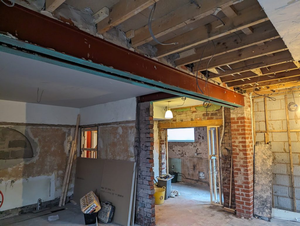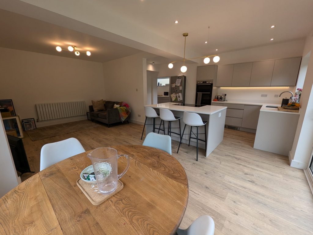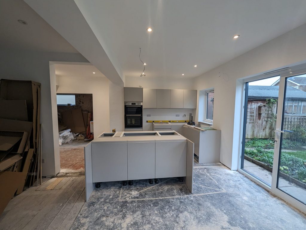 This was a residential project making a 1930s house work for a family in 2024. The existing house was dark to the rear elevation with little light entering the property. The client wanted to make the kitchen a key feature of the home, with this being the heart of the house. The project involves removing the rear wall of the house, creating an open plan kitchen-diner, and creating a 4m opening with sliding doors to maximise light.